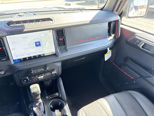 THIS VEHICLE INCLUDES THE FOLLOWING FEATURES AND OPTIONS: Equipment Group 374A Lux Package (Marine Grade Vinyl Bucket Seats, Radio: B&O Sound System by Bang and Olufsen, and Wheels: 17 Black High Gloss-Painted Aluminum), Ford Connectivity Package (1-Year Included), Ford Connectivity Package (one-Time Purchase - 7 Years), Ford Integrated Tether System (FITS) Accessory Package (Bronco-Branded Console Cupholder), Bronco Raptor, 4D Sport Utility, 3.0L EcoBoost V6, 10-Speed Automatic, 4WD, Desert Sand, Black Onyx w/Leather-Trimmed/Vinyl Bucket Seats, Navigation system: Connected Navigation, 12 Speakers, 4-Wheel Disc Brakes, ABS brakes, Air Conditioning, Alloy wheels, AM/FM radio: SiriusXM with 360L, Auto High-beam Headlights, Auto-dimming Rear-View mirror, Automatic temperature control, Brake assist, Cargo Net Kit, Compass, Connected Navigation, Convertible HardTop, Convertible roof lining, Delay-off headlights, Driver door bin, Driver vanity mirror, Dual front impact airbags, Dual front side impact airbags, Electronic Stability Control, Emergency communication system: 911 Assist, Exterior Parking Camera Rear, First Aid Kit, Front anti-roll bar, Front Bucket Seats, Front Center Armrest, Front dual zone A/C, Front fog lights, Front reading lights, Front wheel independent suspension, Fully automatic headlights, Glass rear window, Heated door mirrors, Heated front seats, Heated steering wheel, Illuminated entry, Integrated roll-over protection, Interior Carbon Fiber Pack, Leather Shift Knob, Leather-Trimmed/Vinyl Bucket Seats, Low tire pressure warning, Occupant sensing airbag, Off-Road Assistance Kit, Outside temperature display, Overhead airbag, Overhead console, Panic alarm, Passenger door bin, Passenger vanity mirror, Power door mirrors, Power steering, Power windows, Radio data system, Rear anti-roll bar, Rear seat center armrest, Rear window defroster, Rear window wiper, Remote keyless entry, Security system, SiriusXM with 360L, Speed control, Split folding rear seat, Steering wheel mounted audio controls, SYNC 4, Tachometer, Telescoping steering wheel, Tilt steering wheel, Traction control, Trip computer, Turn signal indicator mirrors, Variably intermittent wipers, and Voltmeter.