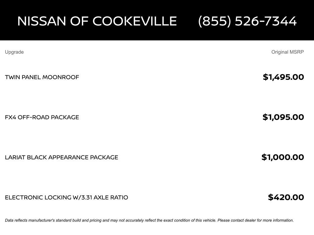 All prices are plus tax, title, registration, fees, dealer doc fee of $899, and any dealer installed options. All inventory must finance through Dealer Provided Lender at standard rates to qualify for the listed price. Vehicle prices may be adjusted due to the dealer's add on accessories. and final price. Any Ford credit rebate requires financing through Ford Motor Credit. Terms and conditions and credit worthiness do apply. Although every reasonable effort has been made to ensure the accuracy of the information contained on this site, absolute accuracy cannot be guaranteed. This site, and all information and materials appearing on it, are presented to the user "as is" without warranty of any kind, either express or implied. All vehicles are subject to prior sale. See dealer for complete details.